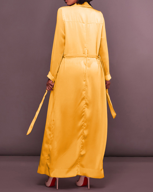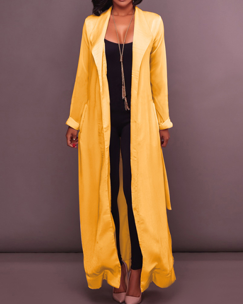 Stylish Turndown Collar Long Sleeves Yellow Chiffon Long Coat