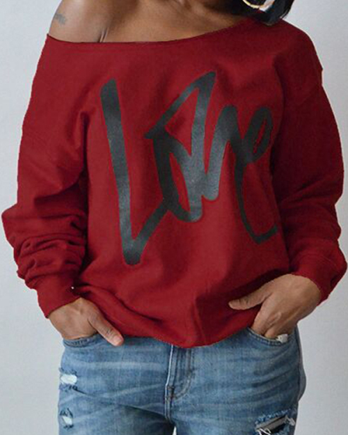 Leisure Round Neck Long Sleeves Letters Printing Purplish Red Cotton Pullover