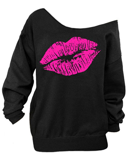 Sexy Dew Shoulder Lips Printed Black Cotton Blends Hoodies