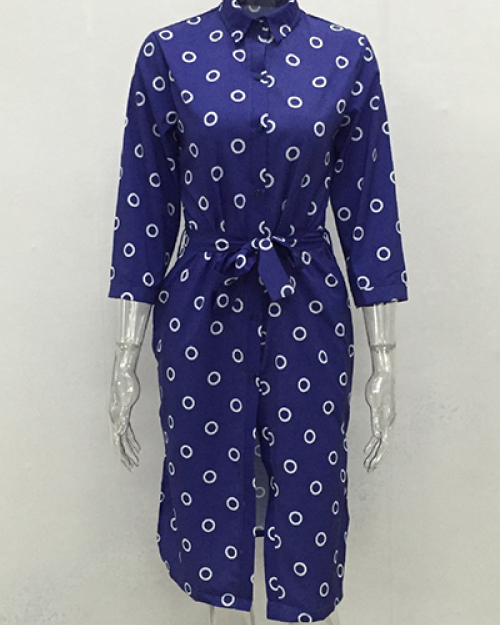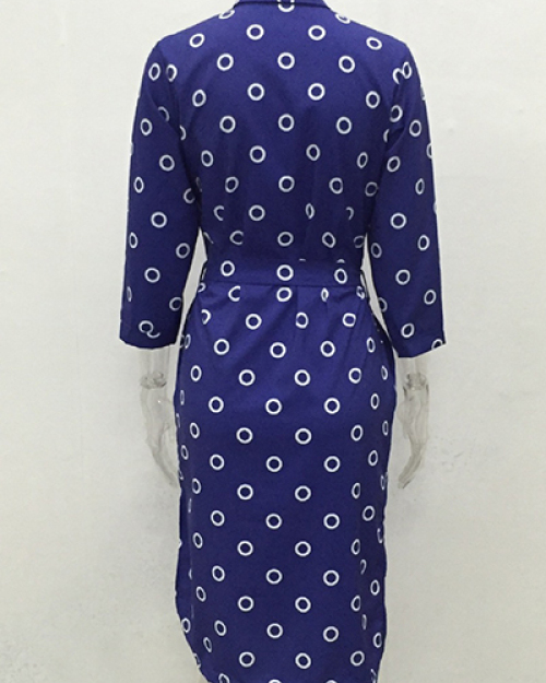 Trendy Turndown Collar Three Quarter Sleeves Polka Dots Printed Blue Polyester Trench Coats