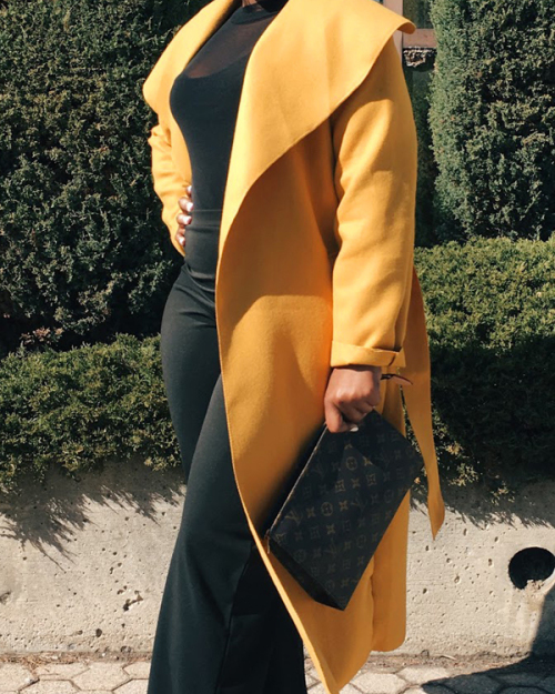 Trendy Turndown Collar Long Sleeves Yellow Cotton Long Wool Coat