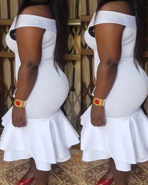 Polyester Sexy Bateau Neck Off The Shoulder Short Sleeve Mermaid Mid Calf Dresses