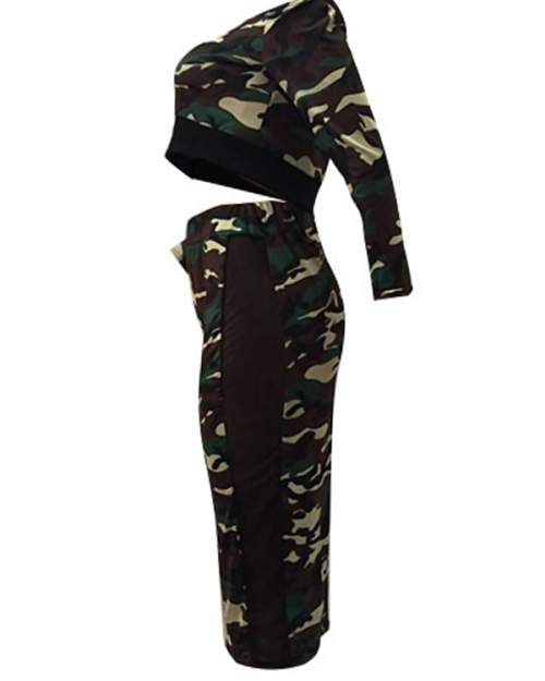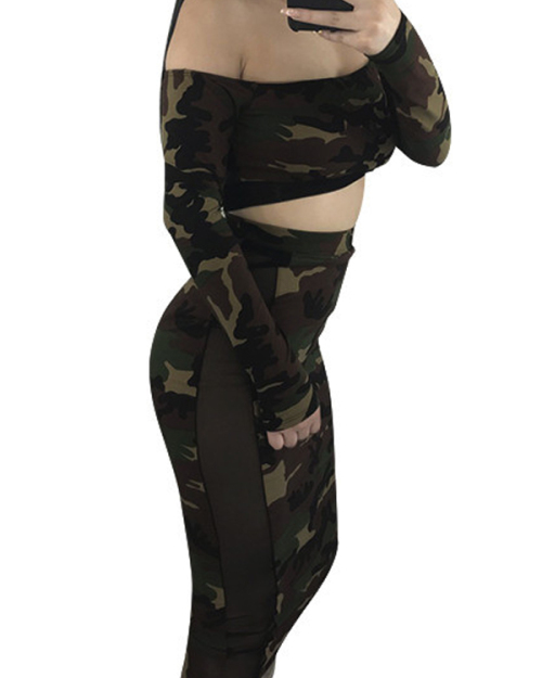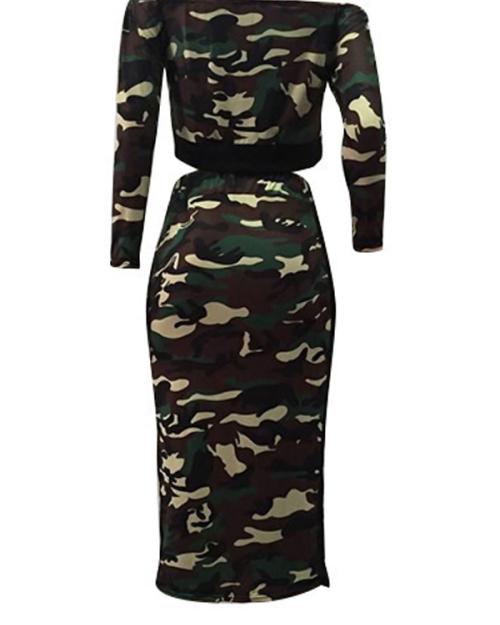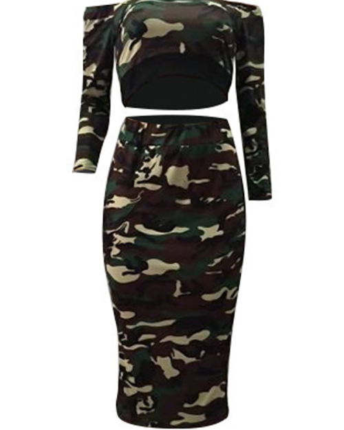 Sexy Bateau Neck Camouflage Printed Army Green Qmilch Two-piece Skirt Set