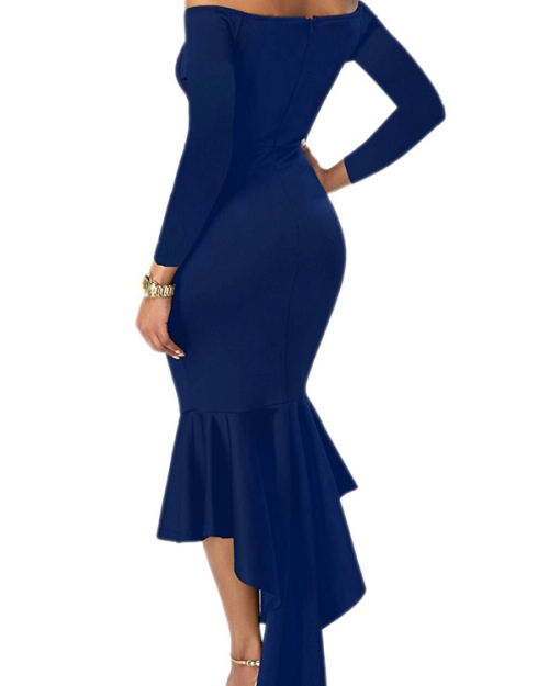 Sexy Bateau Neck Dovetail Shape Design Blue Polyester Ankle Length Dress