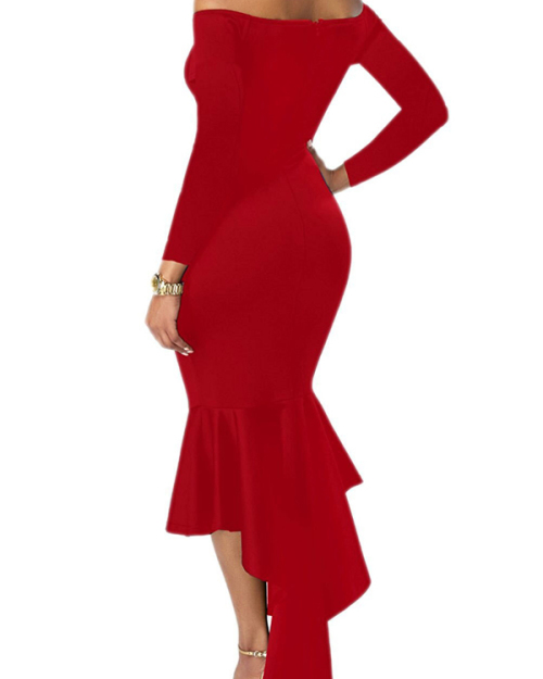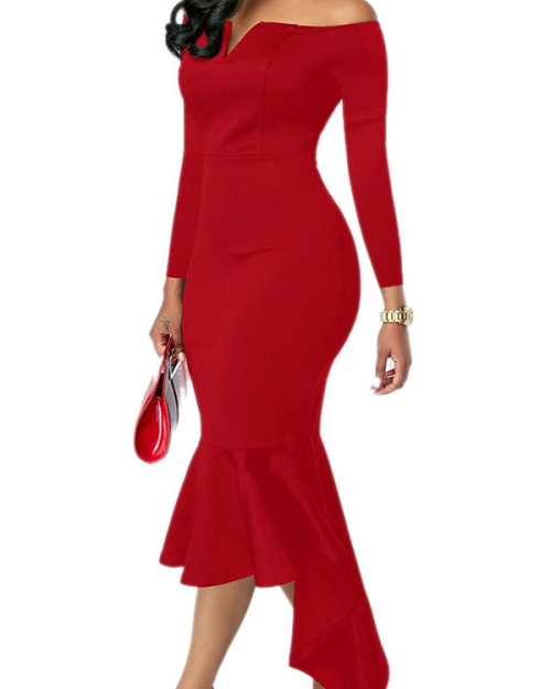 Sexy Bateau Neck Dovetail Shape Design Red Polyester Ankle Length Dress