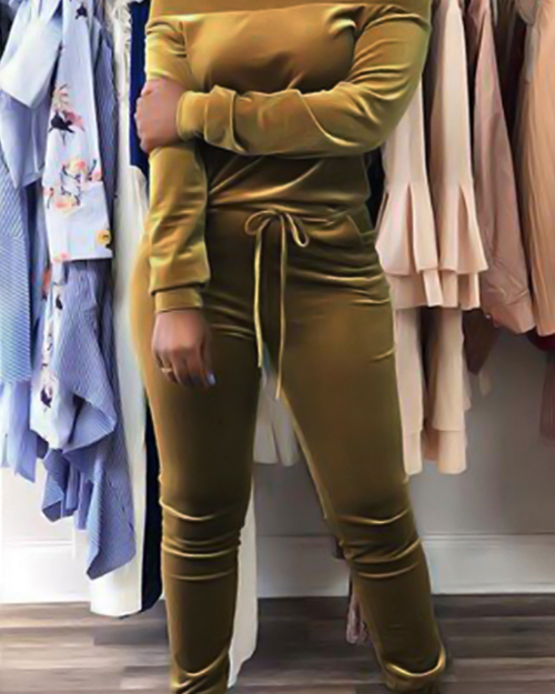 Sexy Bateau Neck Drawstring Yellow Velvet Two-Piece Pants Set