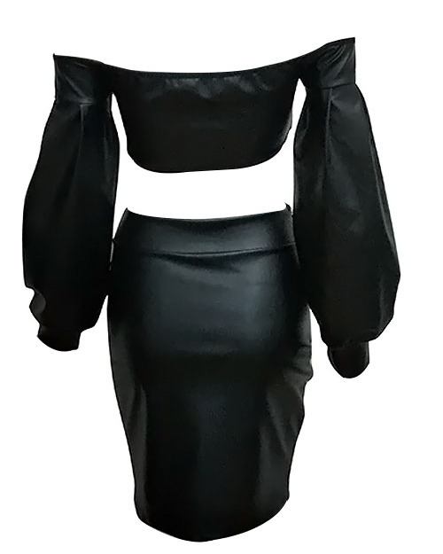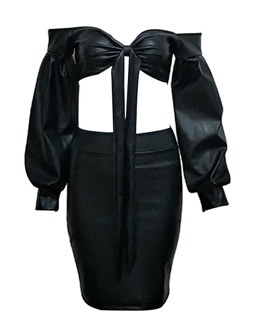 Sexy Bateau Neck Knot Design Black PU Two-piece Skirt Set