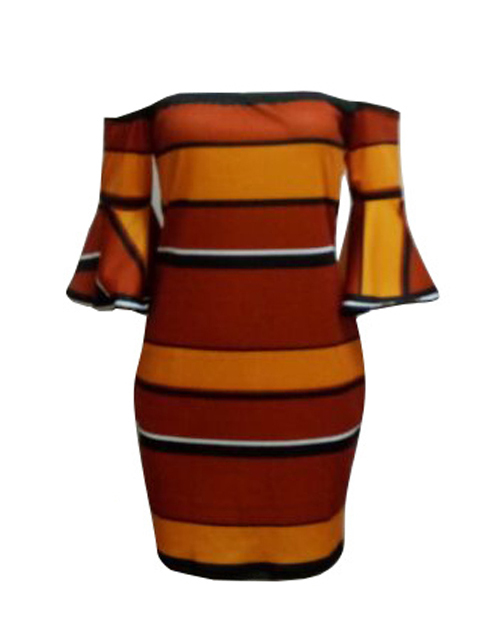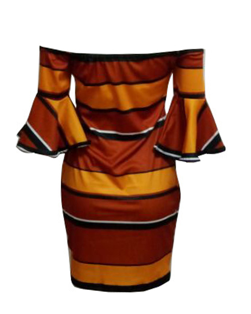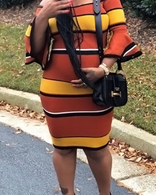 Sexy Bateau Neck Lotus Leaf Sleeves Striped Patchwork Polyester Sheath Mini Dress