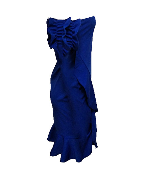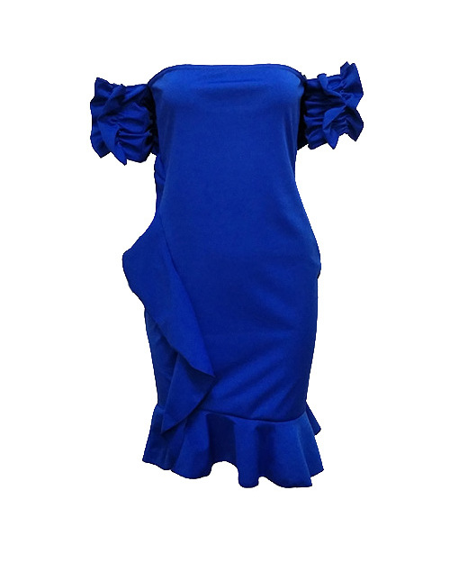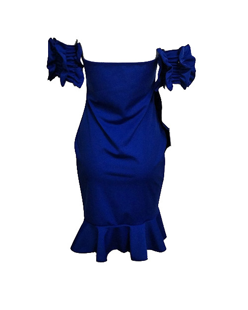 Sexy Bateau Neck Ruffle Design Blue Polyester Knee Length Dress