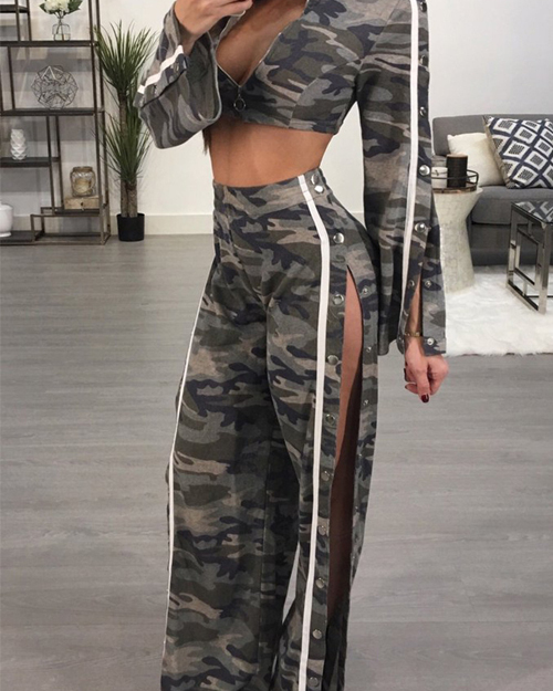 Sexy Camouflage Printed Side Split Polyester Two-piece Pants Set