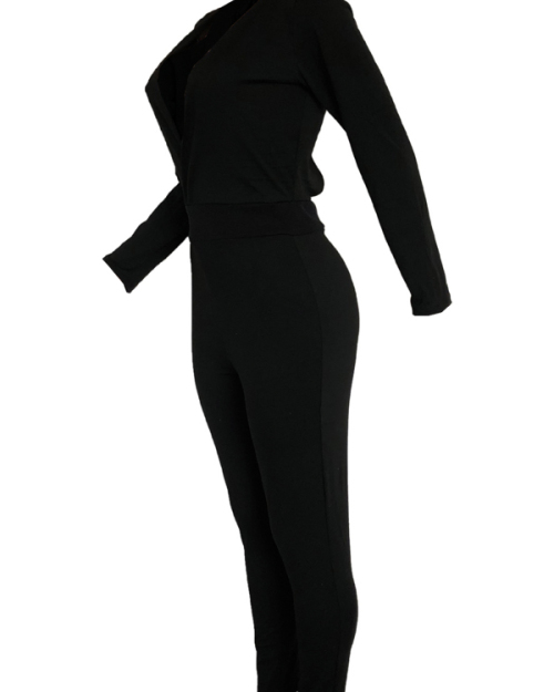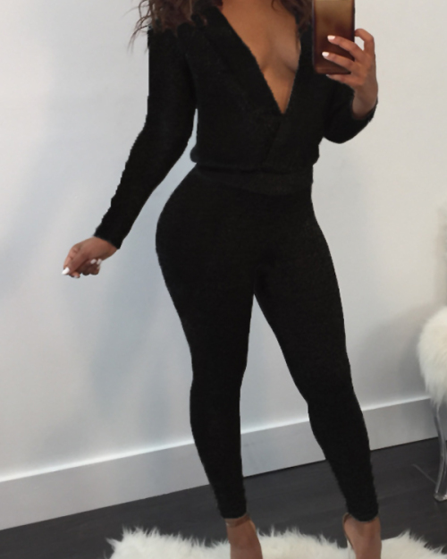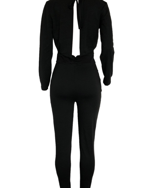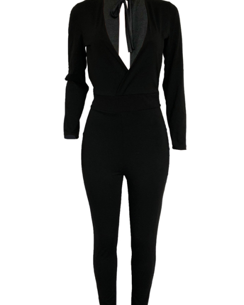 Sexy Deep V Neck Back Hollow-out Black Polyester One-piece Jumpsuits