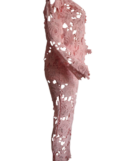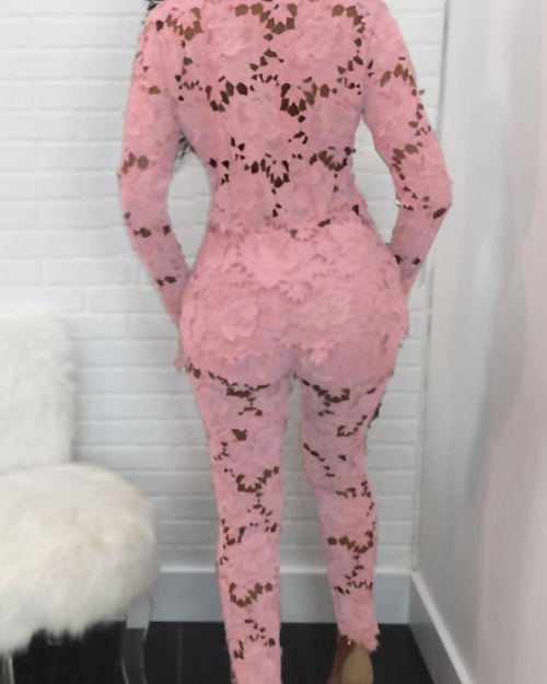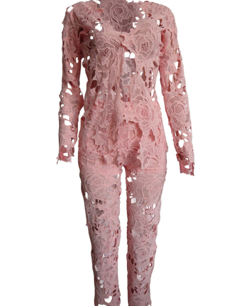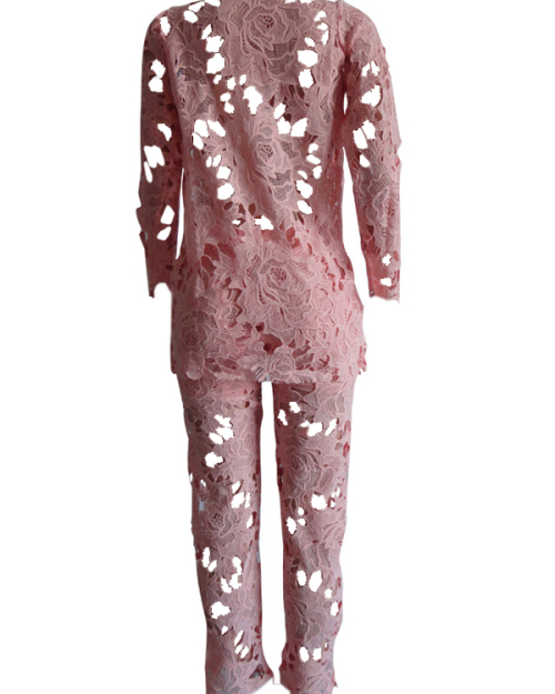 Sexy Deep V Neck Hollow-out Pink Bud SilkTwo-piece Pants Set