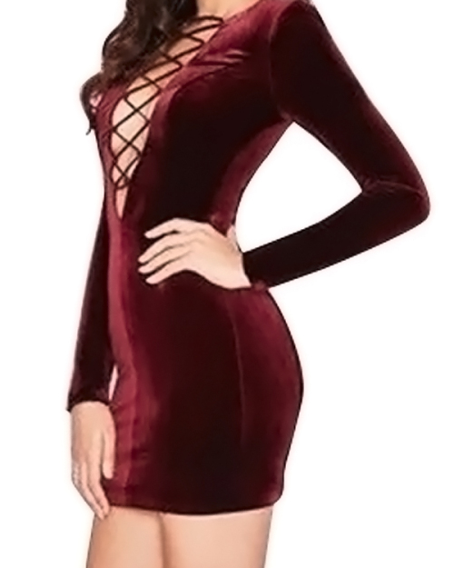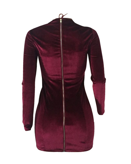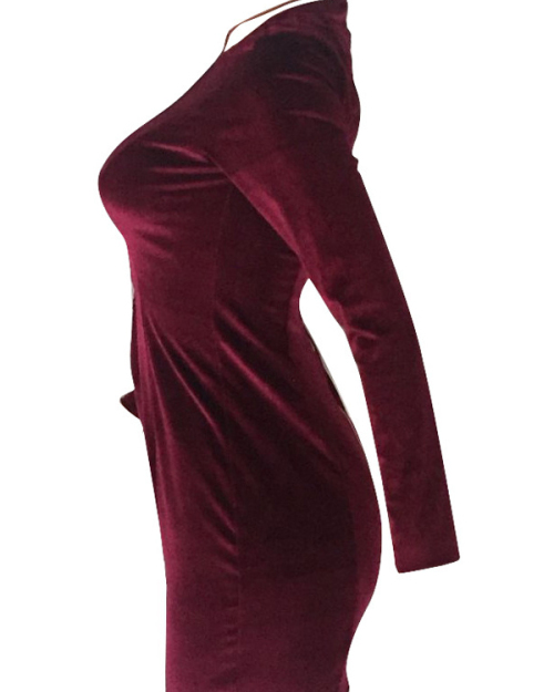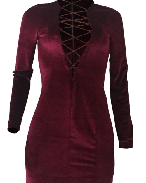 Sexy Deep V Neck Hollow-out Wine Red Velvet Sheath Mini Dress