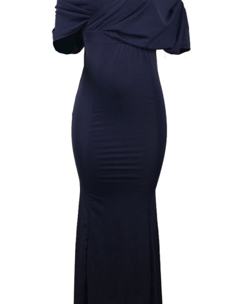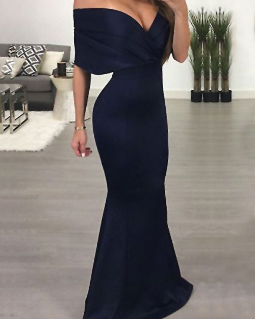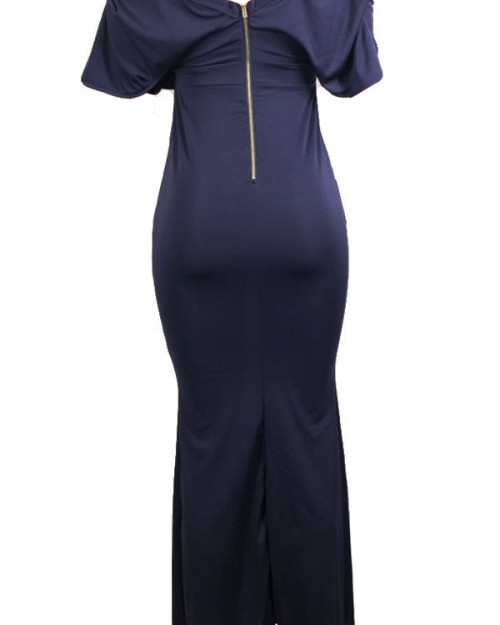 Sexy Deep V Neck Pleated Blue Polyester Floor Length Dress