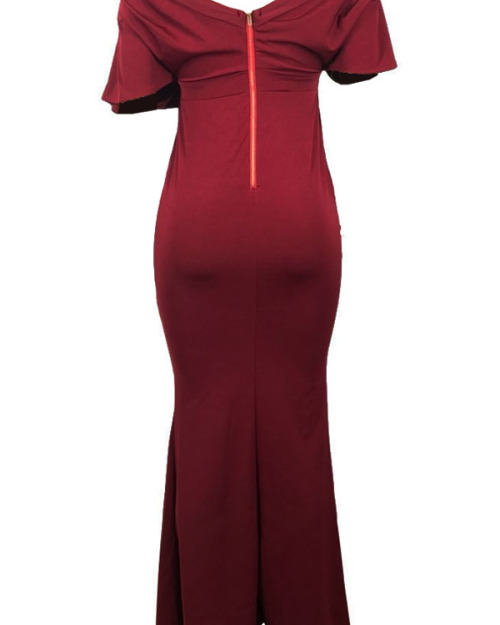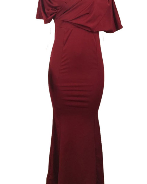 Sexy Deep V Neck Pleated Red Polyester Floor Length Dress