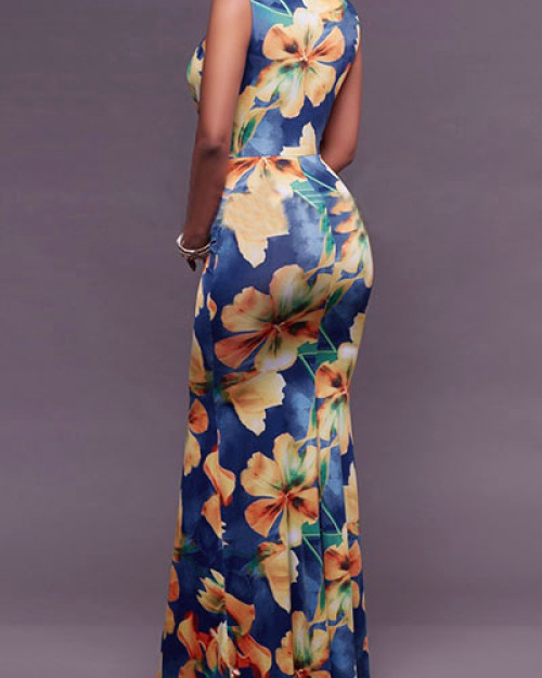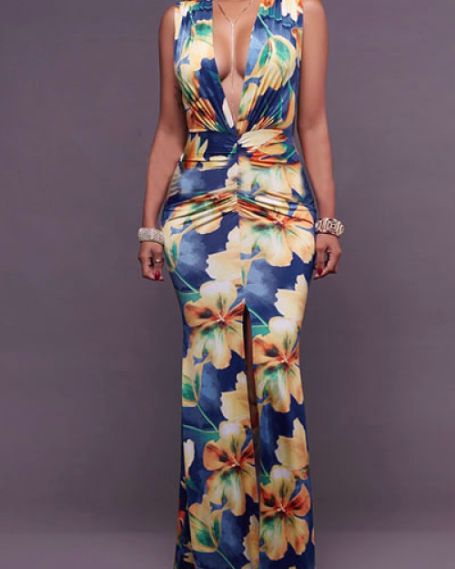 Sexy Deep V Neck Printed Blending Sheath Ankle Length Dress(Non Positioning Printing)