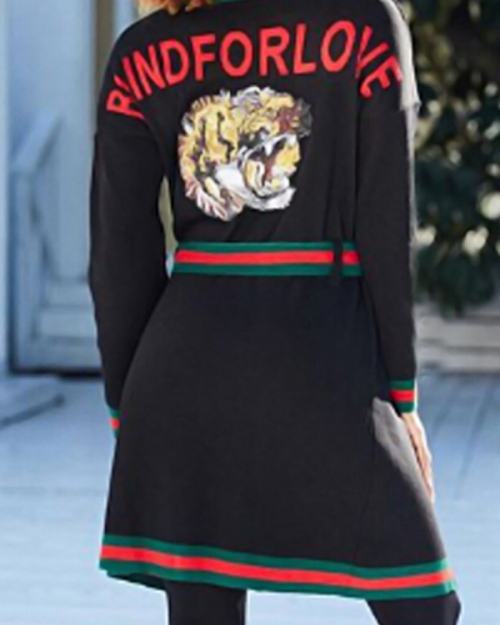 Sexy Deep V Neck Printed Patchwork Black Polyester Long Coat