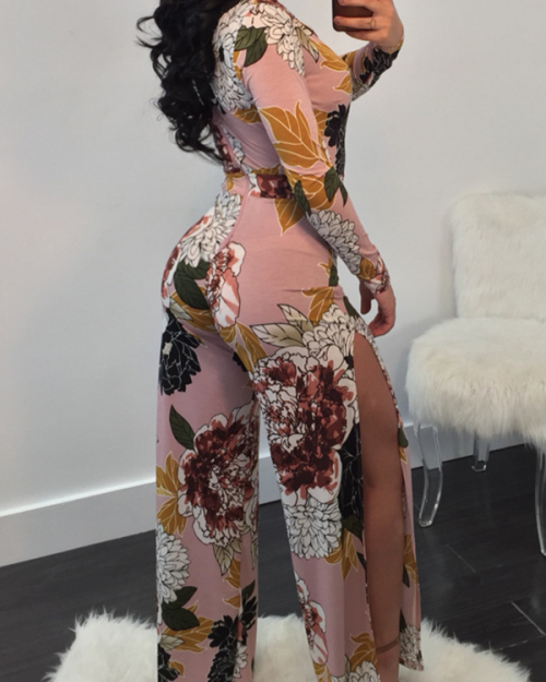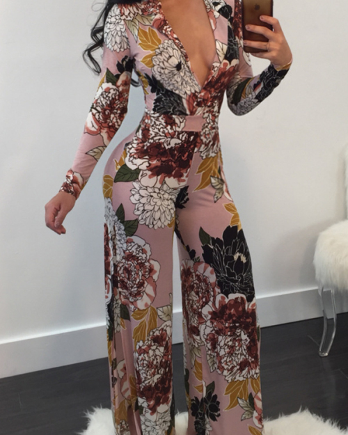 Sexy Deep V Neck Printed Polyester One-piece Jumpsuits