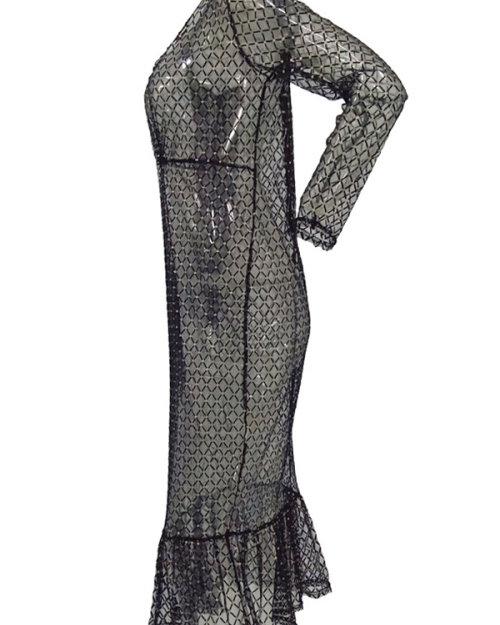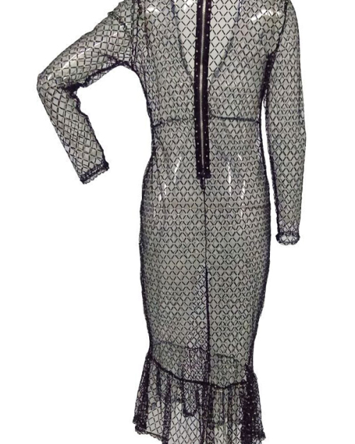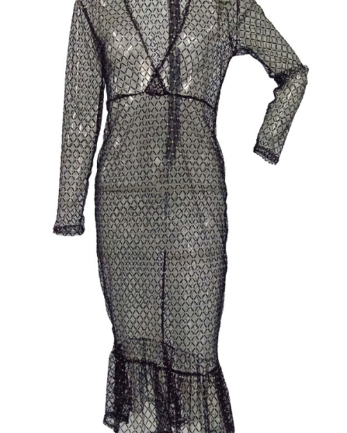 Sexy Deep V Neck See-Through Black Gauze Fishtail Mid Calf Dress(With Briefs)