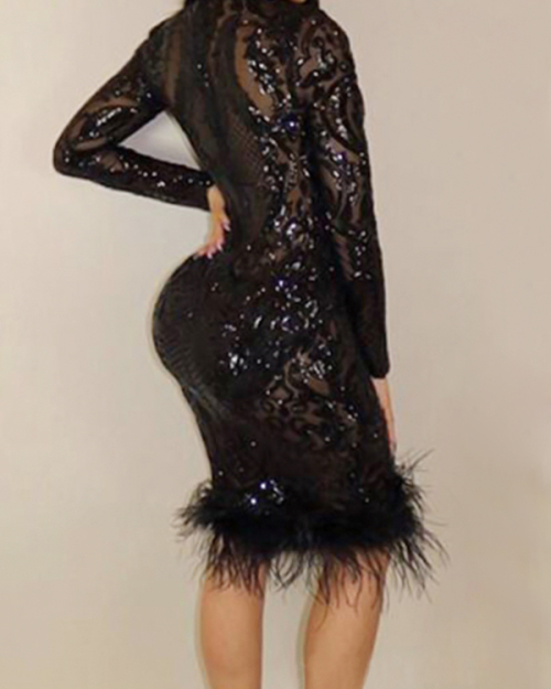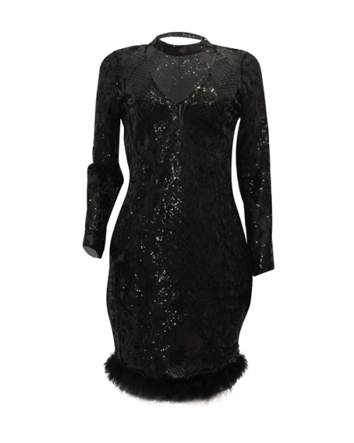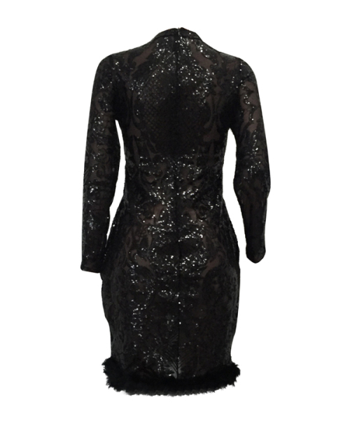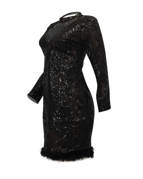 Sexy Deep V Neck See-Through Black Polyester Sheath Knee Length Dress