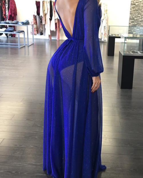 Sexy Deep V Neck See-Through Blue Polyester Floor length Dress(With Lining)