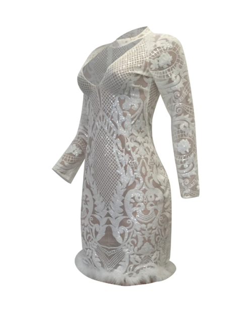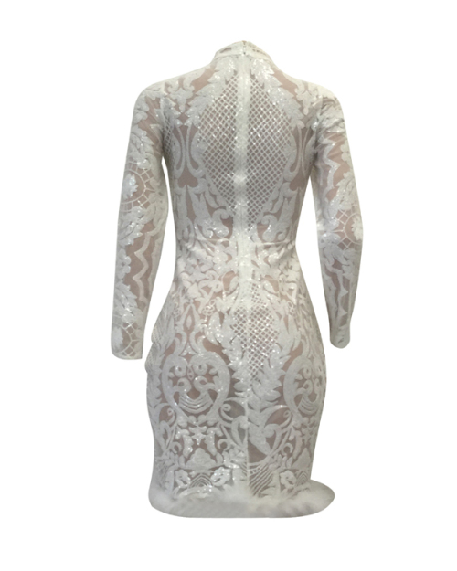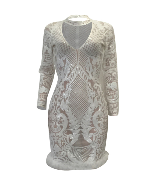 Sexy Deep V Neck See-Through White Polyester Sheath Knee Length Dress