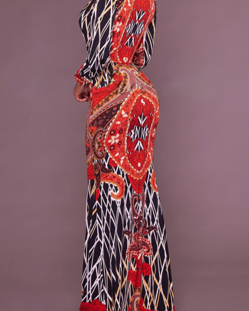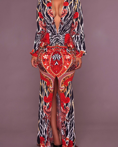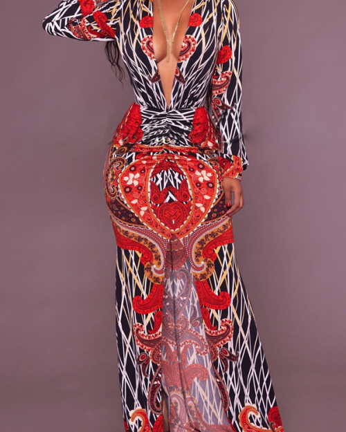 Sexy Deep V Neck Slit Printed Healthy Sheath Ankle Length Dress