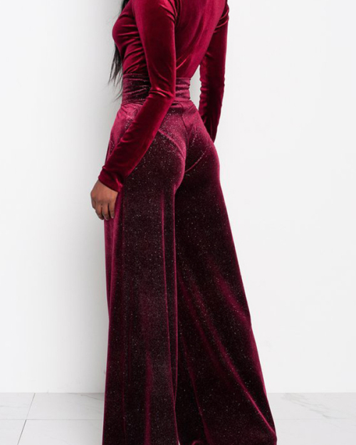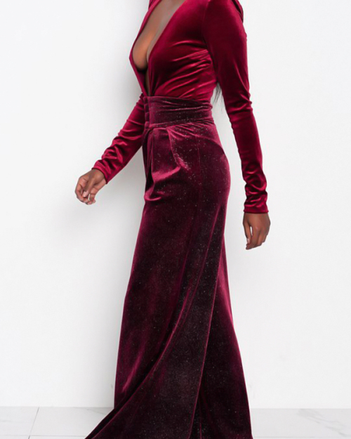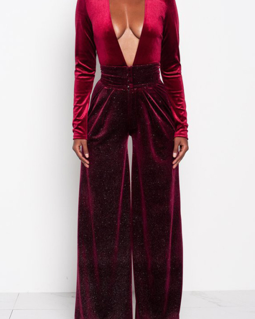 Sexy Deep V Neck Wine Red Velvet One-piece Jumpsuits