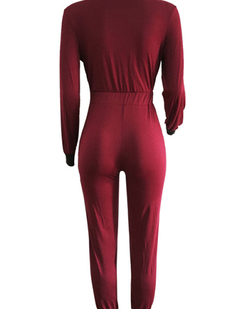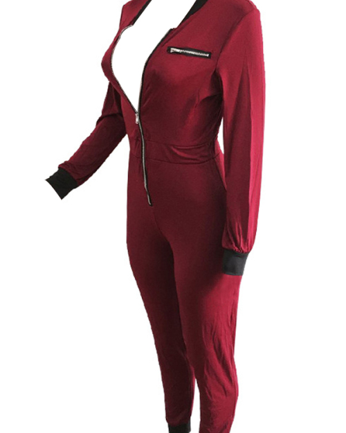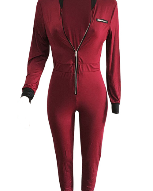 Sexy Deep V Neck Zipper Design Wine Red Polyester One-piece Jumpsuits