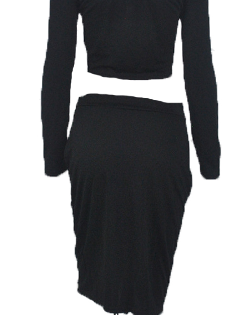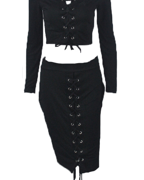 Sexy Dew Shoulder Lace-up Hollow-out Black Cotton Blends Two-piece Skirt Set