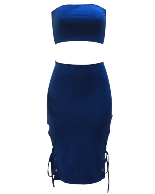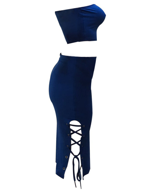 Sexy Dew Shoulder Lace-up Hollow-out Blue Milk Fiber Two-piece Skirt Set