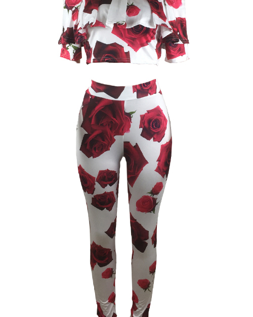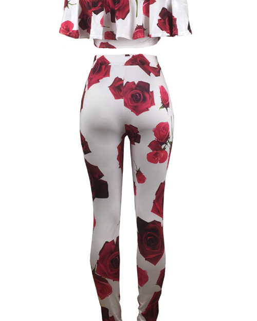 Sexy Dew Shoulder Rose Printed White Milk Fiber Two-piece Pants Set