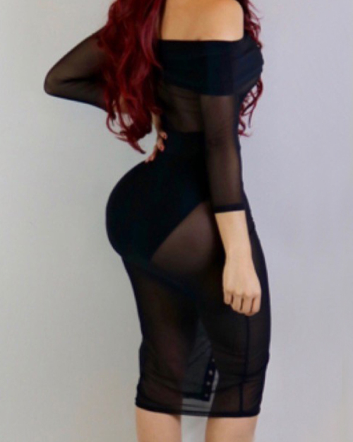 Sexy Dew Shoulder See-Through Black Gauze Sheath Knee Length Dress(Without Lining)