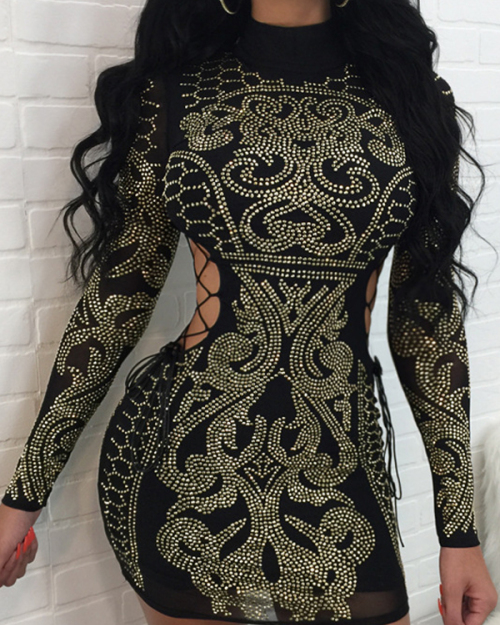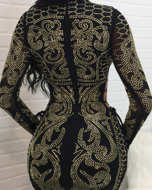 Sexy Hollow-out Rhinestone Decorative Black Polyester Mini Dress
