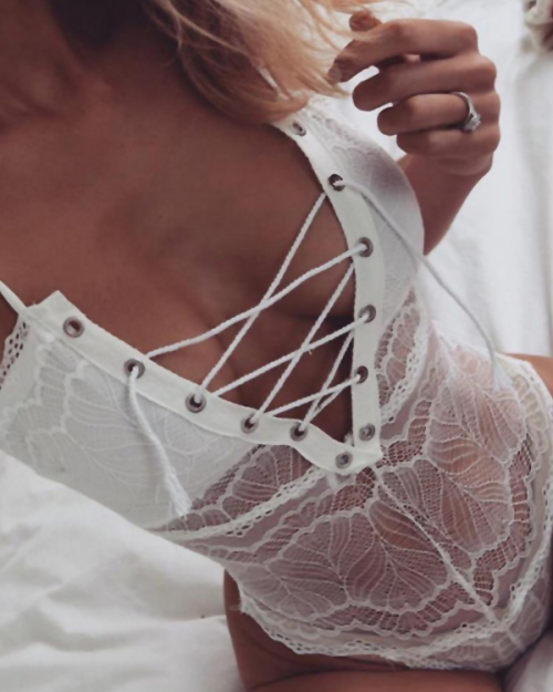 Sexy Lace-up See-Through White Lace One-piece Jumpsuits
