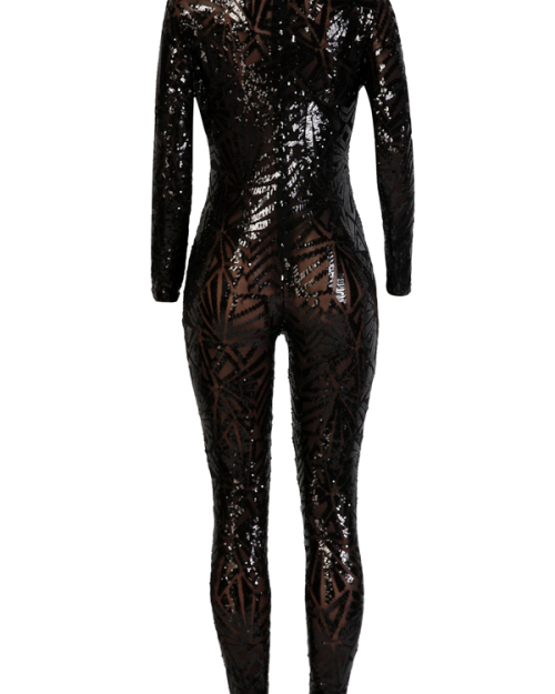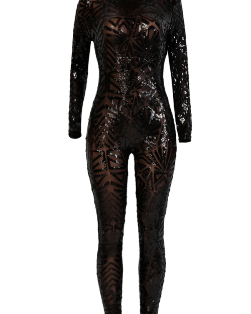 Sexy Printed See-Through Black Polyester One-piece Jumpsuits(Without Lining)