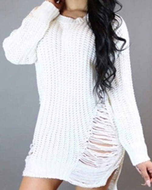 Sexy Round Neck Broken Holes Torn Edges White Polyester Mini Dress