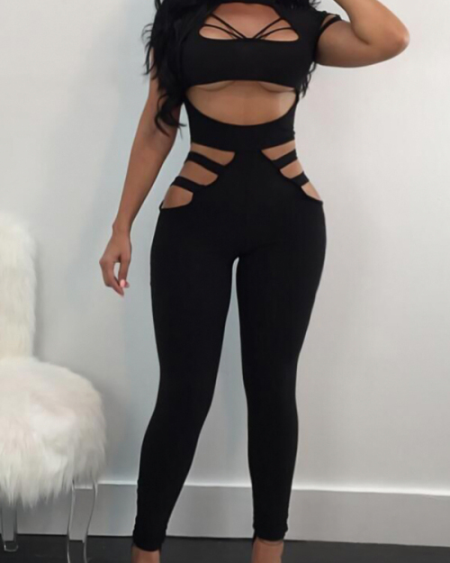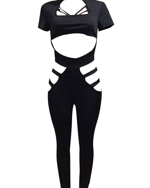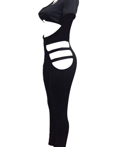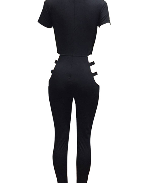 Sexy Round Neck Hollow-out Black Polyester One-piece Jumpsuits