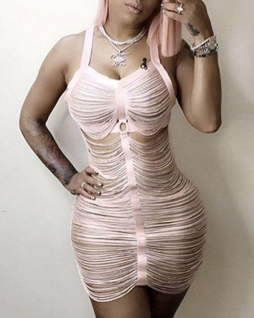 Sexy Round Neck Hollow-out Khaki Polyester Sheath Mini Dress