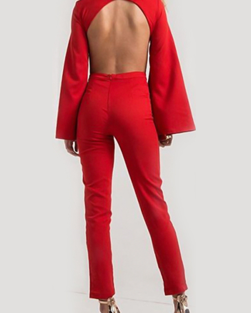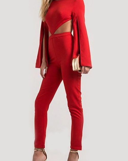 Sexy Round Neck Hollow-out Red Polyester One-piece Jumpsuits