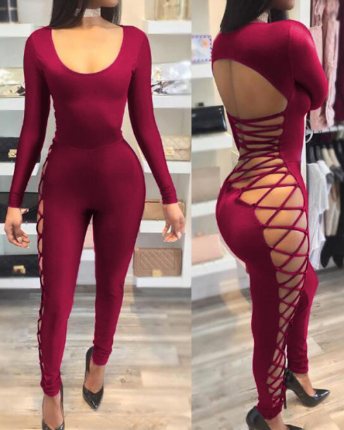 Sexy Round Neck Hollow-out Wine Red Milk Fiber One-piece Skinny Jumpsuits