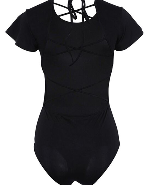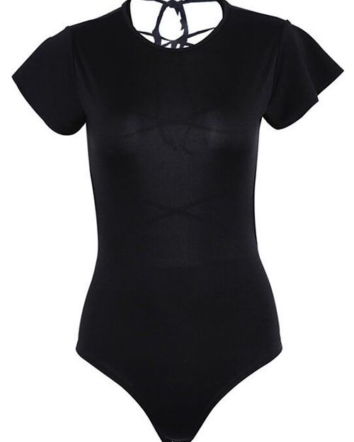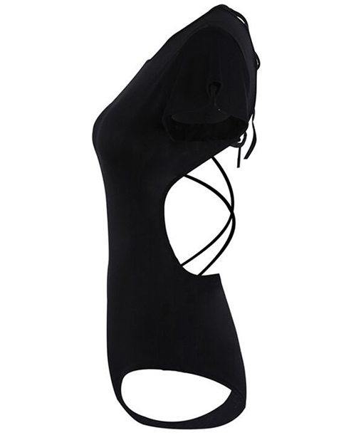 Sexy Round Neck Lace-up Hollow-out Black Polyester One-piece Bodysuit