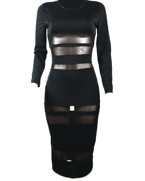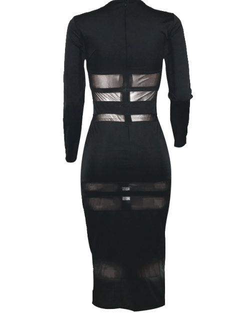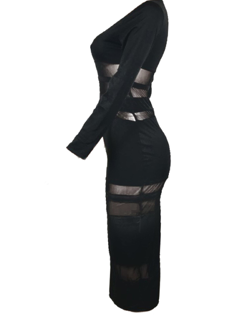 Sexy Round Neck Long Sleeves Gauze Patchwork Black Polyester Sheath Mid Calf Dress(Without Choker
