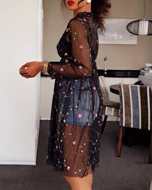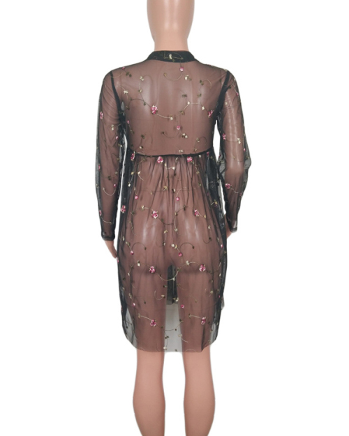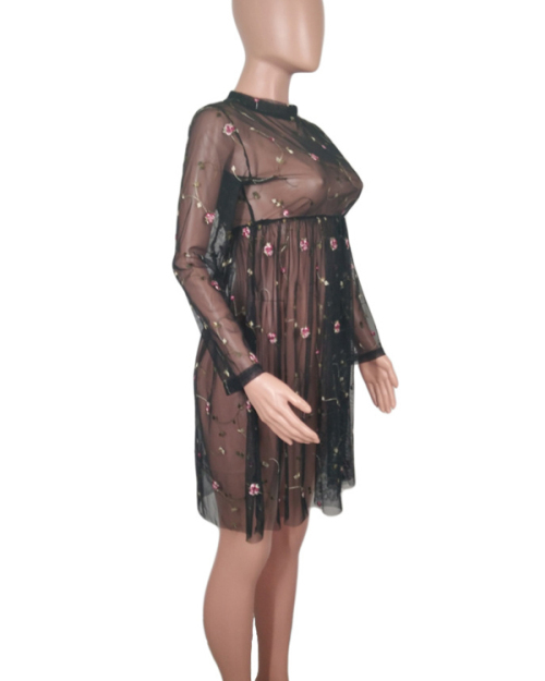 Sexy Round Neck Long Sleeves See-Through Black Polyester Knee Length Dress