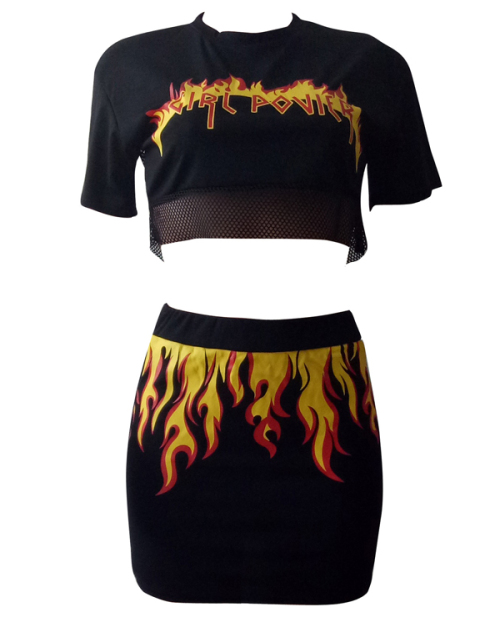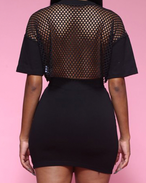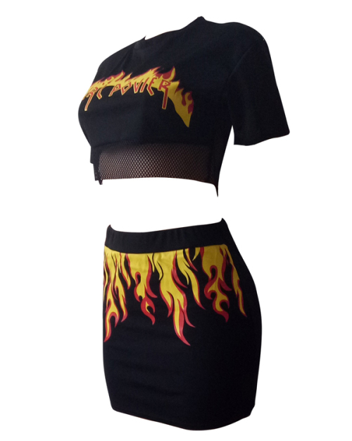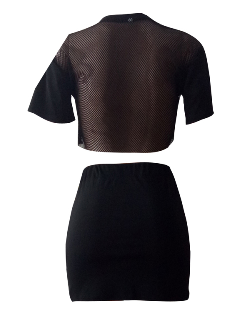Sexy Round Neck Printed Hollow-out Black Polyester Two-piece Skirt Set