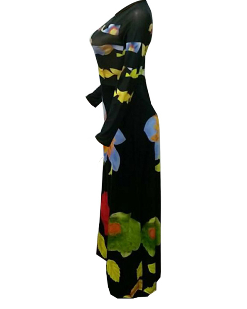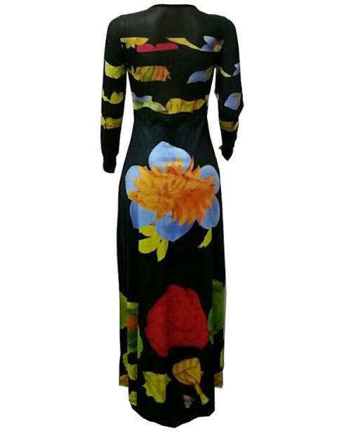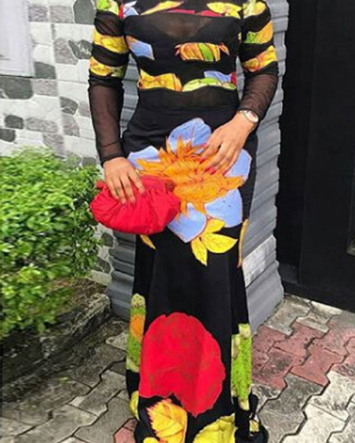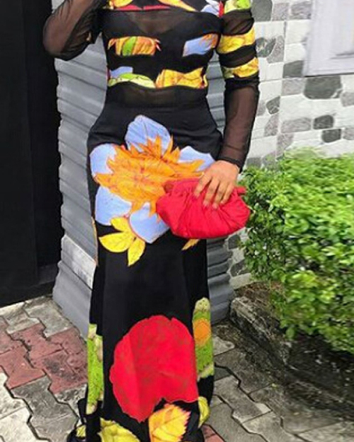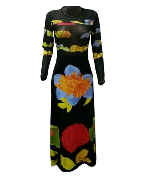 Sexy Round Neck Printed See-Through Healthy Fabric Sheath Ankle Length Dress