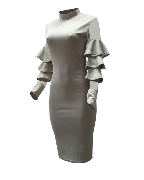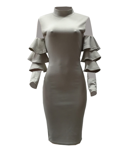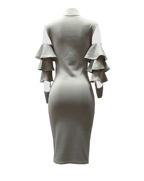 Sexy Round Neck Ruffle Sleeves Gauze Patchwork Grey Polyester Knee Length Dress