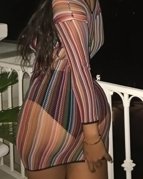 Sexy Round Neck See-Through Rainbow Striped Printed Gauze Sheath Mini Dress(Without Subcoating)