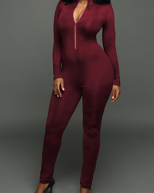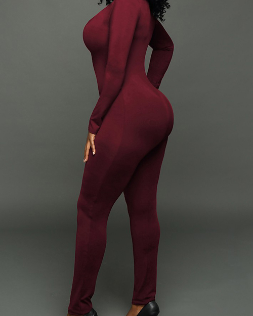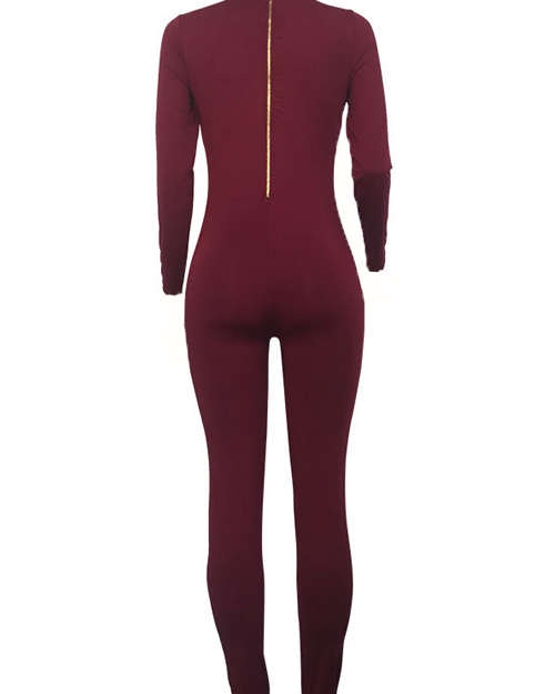 Sexy Round Neck Zipper Design Jujube-red Milk Fiber One-piece Skinny Jumpsuits