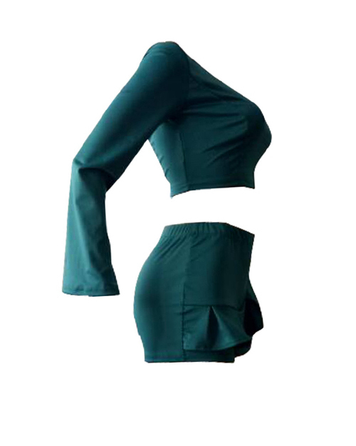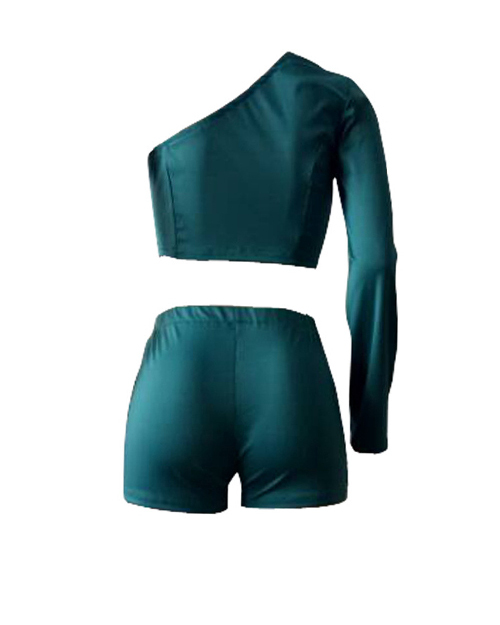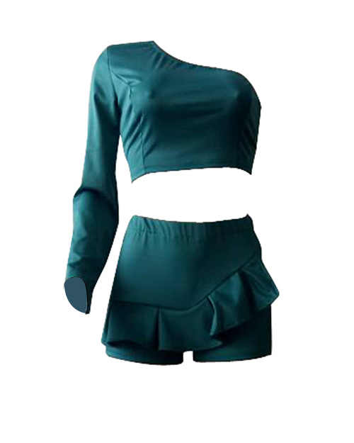 Sexy Show A Shoulder Falbala Design Green Twilled Satin Two-piece Shorts Set